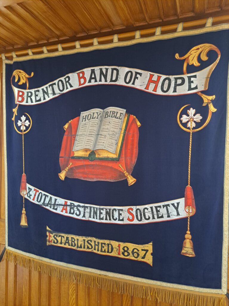 The Brentor Band of Hope & Total Abstinence Society Banner is an enriching item within the museum collection, hung beautifully inside the Fenner Room, opposite the doors that lead across to the Library.